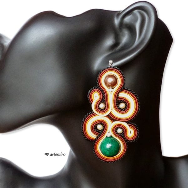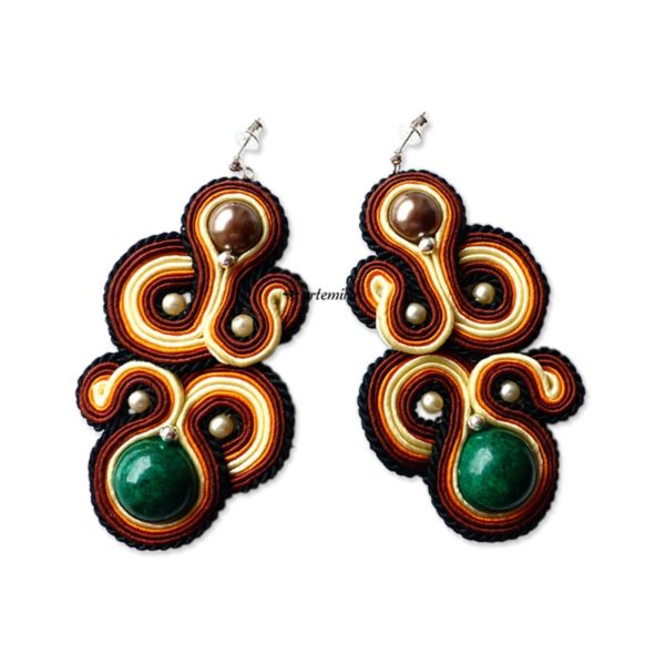 Kolczyki wykonane niezwykle czasochłonną techniką haftu sutasz (soutache). Technika ta wymaga dużej precyzji i staranności. Koraliki oplecione zostały sznurkami sutasz w kolorze bananowym, pomarańczowym i brązowym. Brzegi obszyte zostały czarnym splecionym sznurkiem.